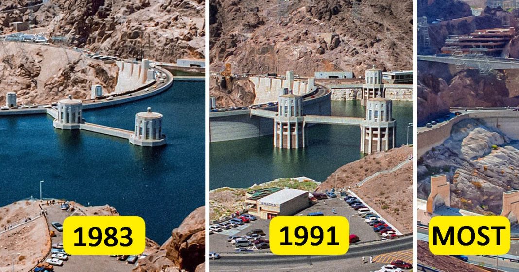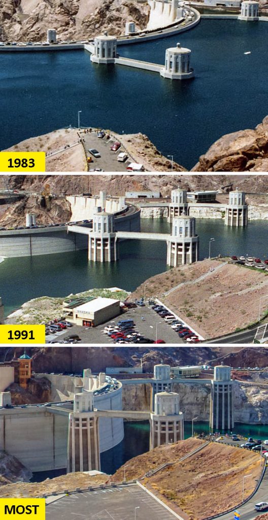 Ez a gát az Egyesült Államok Nevada és Arizona államának határán található. És láthatjuk, hogy a vízszint mennyit csökkent az elmúlt évtizedekben.