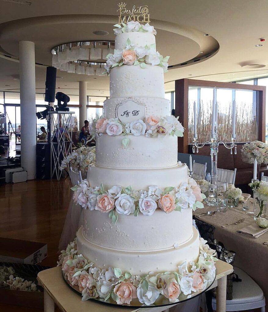 A vendégek egy hétszintes, öt méter magas, 200 kilós esküvői tortát élveztek, amely 3000 fehér cukormázból készült Grand Marnier vajkrémből készült.