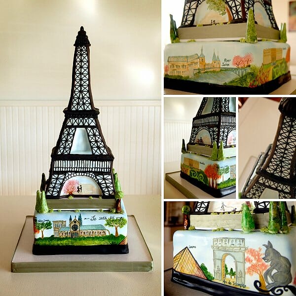 A világ legelismertebb nevezetessége rajongói számára ez egy példa a c’est magnifique esküvői tortára. Nemcsak az Eiffel-toronyra hasonlító tökéletesen kidolgozott, hanem más párizsi helyszínek kézzel festett képeit is tartalmazza: a Diadalívet, a Szajna folyót és a Notre Dame-székesegyházat. Ez egy műalkotás.