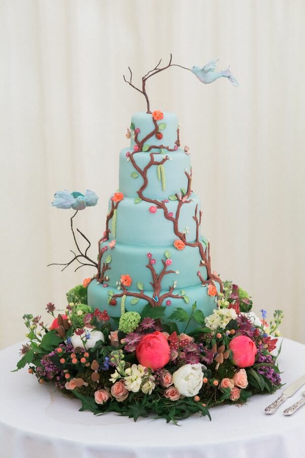 Hát nem csodálatos? Ez a torta robin tojáskék fondantot és két szeszélyes repülő madarat tartalmaz!