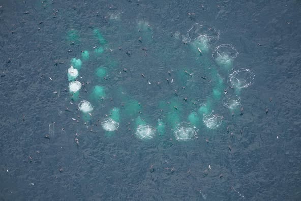 A buborékos táplálkozás vagy buborékhálózás néven ismert hosszúszárnyú bálnák lenyűgöző módon biztosítják zsákmányukat – krilleket és halakat. „Amint a halakat befogták, a felszín felé lökik őket, és elnyelik, ahogy a bálnák felfelé vetődnek a kör alakú buborékhálón keresztül” – magyarázza a NOAA Fisheries ezt a lenyűgöző viselkedést.
