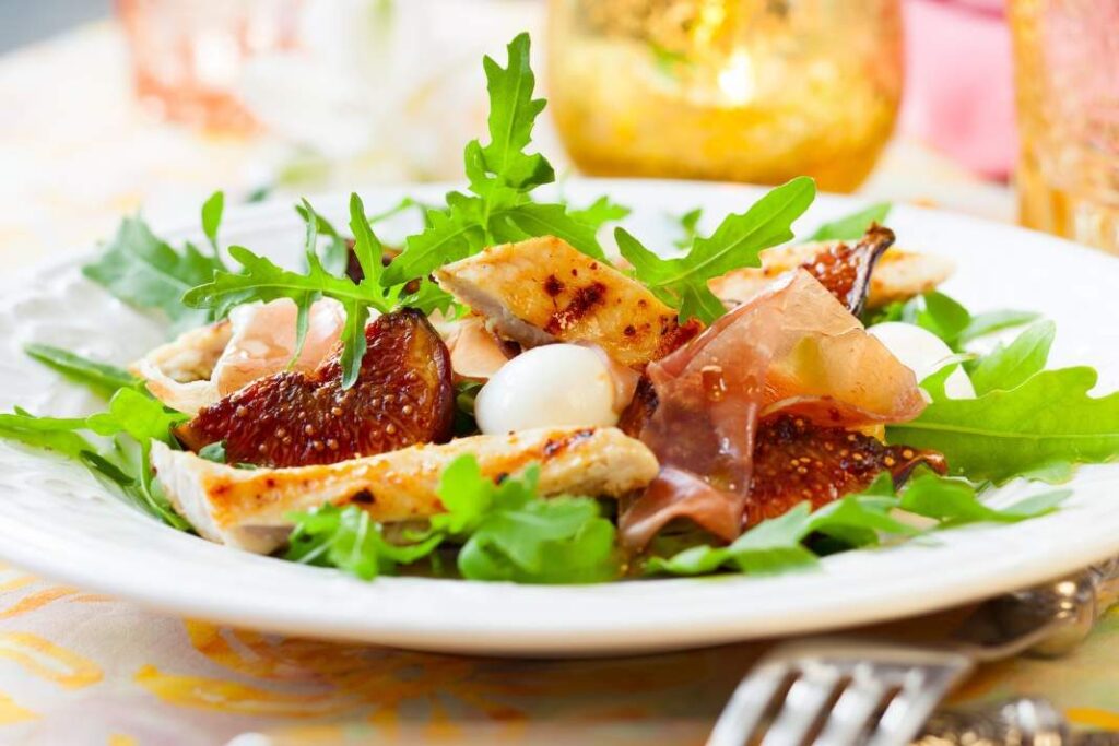 A csirkemellet szeleteld fel, keverd össze a rukkolával, a lilahagymával és a fügével. Szórd meg feta sajttal, majd locsold meg az öntettel.