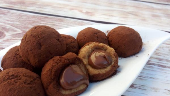 Ezt 10-15 percre hűtőbe adja, majd kis adagot veszünk ki a masszából. Két tenyerünk közt ellapítjuk és teszünk a közepére egy mokkáskanál nutellát. Golyóvá formáljuk, kakaóporba forgatjuk.