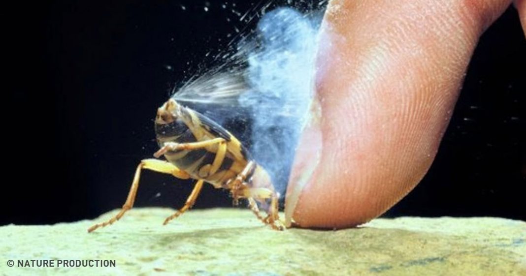 A VESZÉLYEZTETETT BOMBÁZÓ BOGÁR KILÖVELLI A FORRÓ VEGYSZERPERMETET A POTROH CSÚCSÁBÓL. A FOLYADÉK HALÁLOS A ROVAROK TÁMADÁSA ELLEN, DE MÉG AZ EMBER SZÁMÁRA IS FÁJDALMAS.