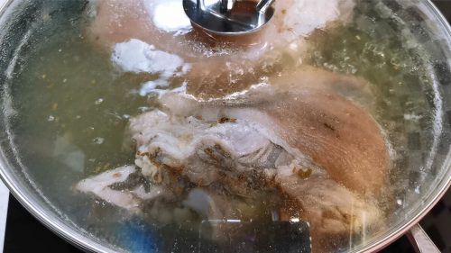 ezt lefedem a fazekat, és a lángot a legkisebbre veszem, majd másfél órán keresztül főzöm. Időnként megforgatom a csülköket, hogy folyamatosan főjenek meg.