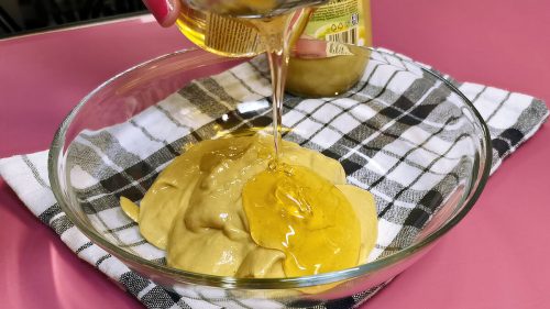 Mézes-mustáros máz készítése : A főzés vége előtt néhány perccel elkészítem azt az egyszerű szószt, amely finom puhaságot és aranybarna színt kölcsönöz a csülköknek. Ehhez simára keverek egy adag lágy mustárt és mézet.