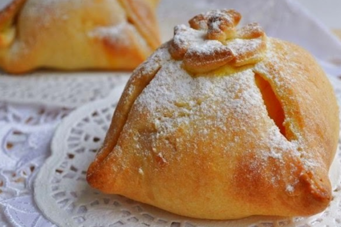 A négyzetek ellentétes oldalainak sarkait hajtsuk fel, csípjük össze. Az ilyentén keletkezett almás batyukat kenjük be felvert tojással. Tegyük be a sütőbe és süssük őket 30 percig.