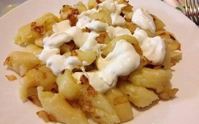 Még forrón hozzákeverjük annyi listát, hogy sűrű, és megáll benne a fakanállal. Amikor már nehezen megy a keverés elég a liszt, és még 1-2 percig keverjük. Levesz a tűzhelyről, addig szikkadni hagyjuk míg a hagymát megpirítjuk. Kockára vágott vöröshagymát pirítunk aranybarnára zsírba vagy olajba.