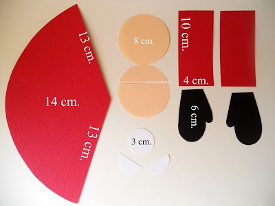 Elsőként vágd ki a piros kartonból a mikulás sapkáját és kézszárát, a fehérből a bajuszát, a feketéből a kesztyűjét és a barack színűből az arcát.