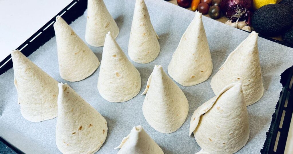 Tekerd fel tölcsér formájúra a fél tortillákat, majd rögzítsd a szélét fogpiszkálóval: