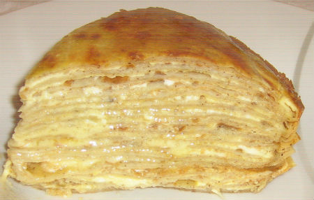 Ezután kenjük meg mákkal, ismét palacsinta, amit lekvárral kenjünk meg. Ismét palacsinta, majd a túrós keverék követezik, majd rétegezzük, amíg a hozzávalók elfogynak. A tetejére kerüljön palacsinta, amit kenjünk meg tojással elkevert kefirrel. Tegyük a tortát forró sütőbe, és süssük közepes lángon 15-20 percig.